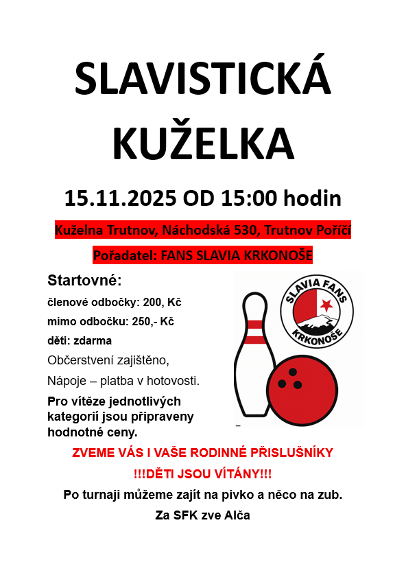 Slavia Fans Krkonoše Vás zvou na každoroční kuželkový turnaj.